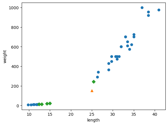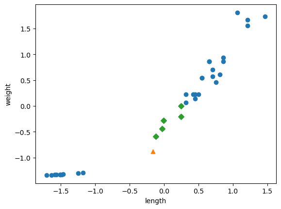 * 중요한 사항으로 표준점수는 훈련세트의 데이터를 테스트 세트에 적용해야 한다 ( 평균, 표준편차 )