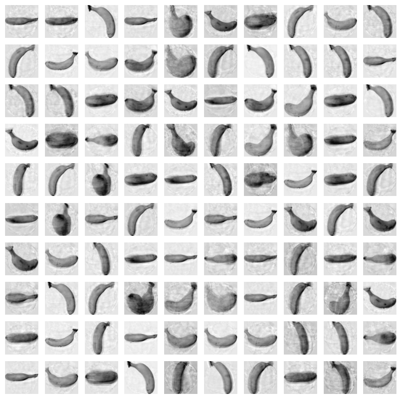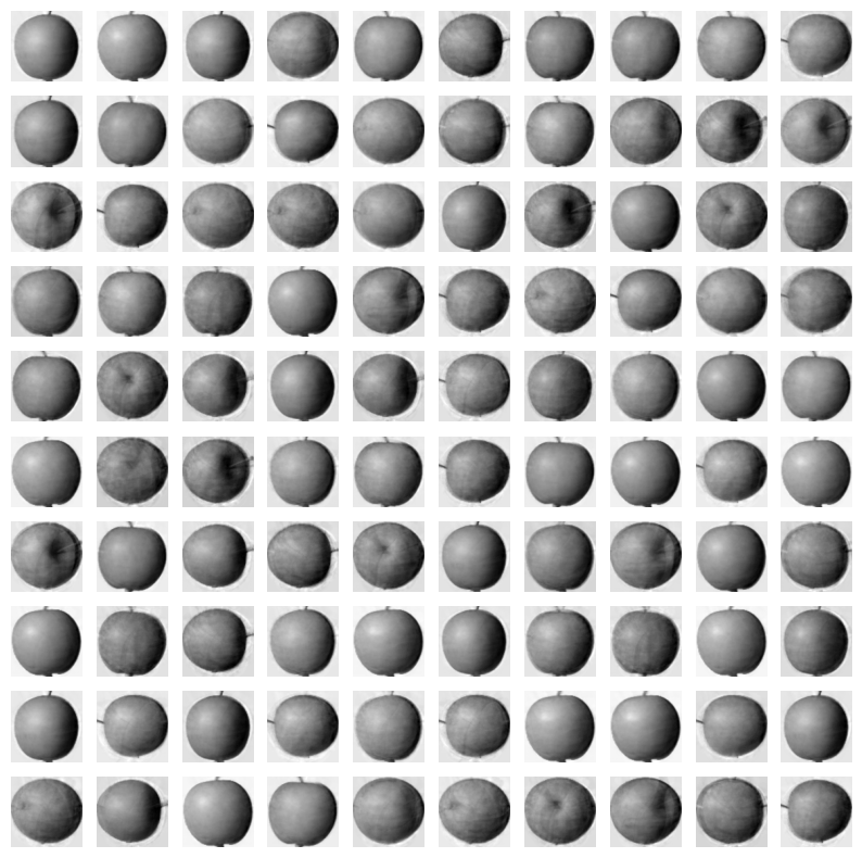 fruits_reconstruct = fruits_inverse.reshape(-1, 100, 100)
