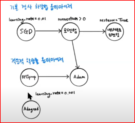 - 옵티마이저도 하이퍼파라미터 중 하나로, 경사하강법의 종류에 대한 설정을 한다.
