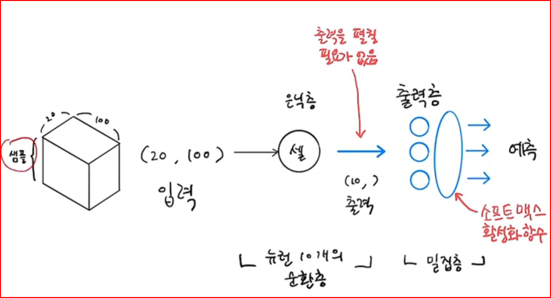 - 이렇게 구성된 3차원 텐서, 배열이 순환층을 통과하게 되면 순환층에 있는 뉴런의 개수만큼 출력이 만들어지며 1차원 출력물이 만들어진다. 샘플이 여러개가 있다면 2차원 배열이 1개만 있다면 1차원 배열이 된다.
