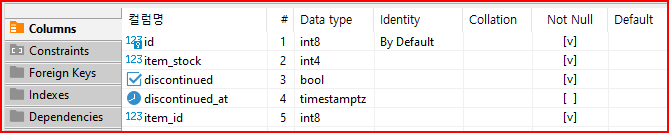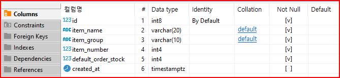 - postgresql에서 지원하는 serial4 데이터 타입으로 필드를 생성하면 자동으로 default 속성에 자동 증가를 위한 "nextval('sync_test.items_id_seq'::regclass)" 가 정의된다.