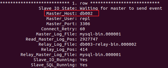 6) db003에 접속하여 mysql 명령으로 "show slave status\G" 명령어를 치면, Master_Host가 db002로 되어 있음
