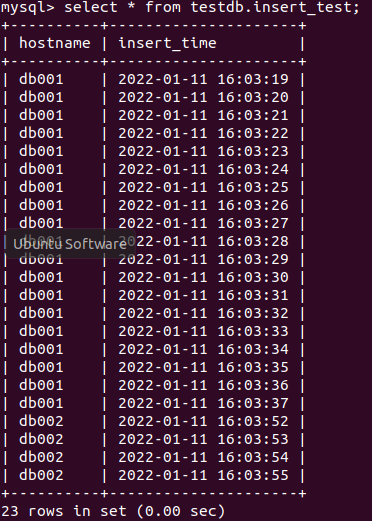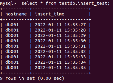 - insert 스크립트가 동작 중 db001 컨테이너를 중지하고 db002 컨테이너에서 testdb의 insert_test 테이블 확인