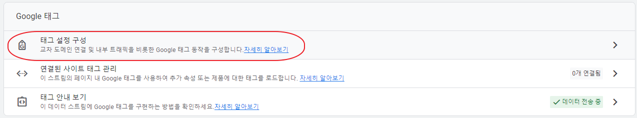 2. 변경할 데이터 스트림을 누르고 화면 제일 하단에 있는 Google 태그의 태그 설정 구성을 누른다.