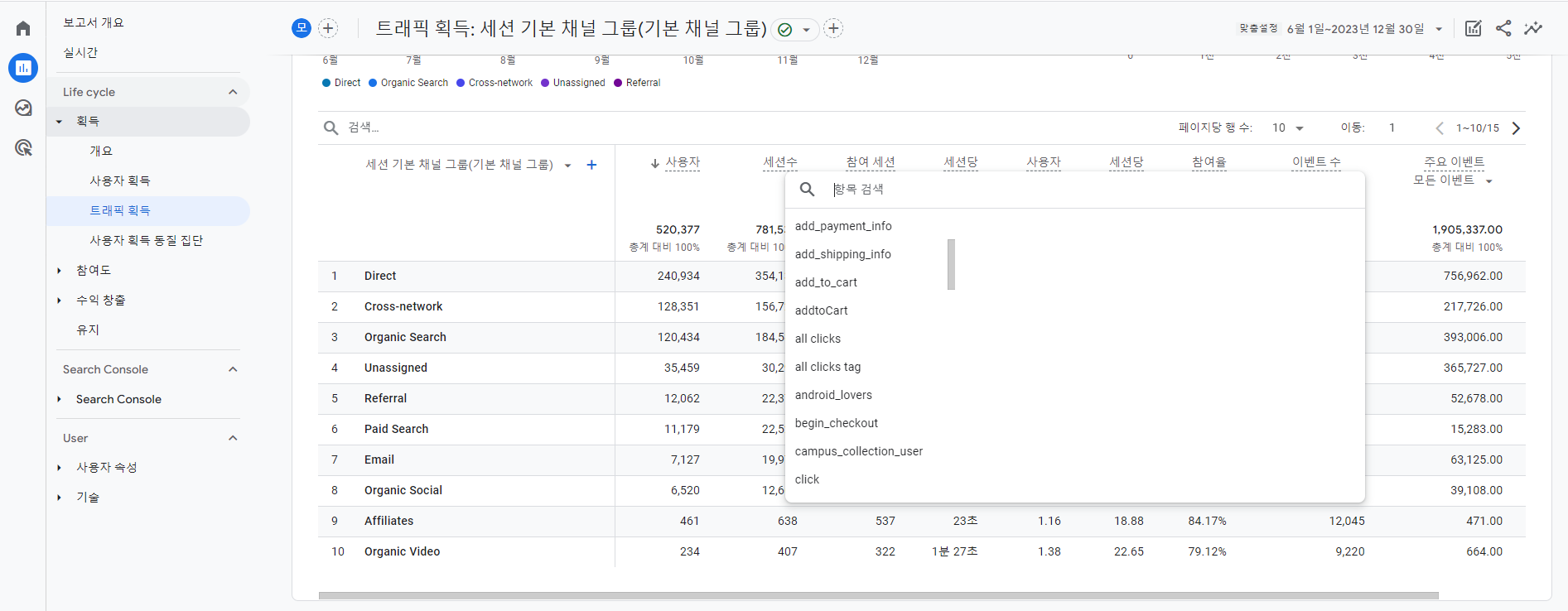 - 보고서 -> 획득 -> 트래픽 획득 메뉴를 클릭하여 나오는 화면에서 이벤트 컬럼의 필터를 변경할 수 있다.