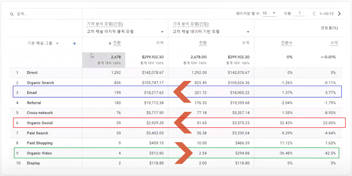- 마지막 클릭 모델보다 데이터 기반 모델의 값이 큰 경우, 자체적인 전환보다 다른 채널의 도움이 필요한 것으로 평가할 수 있다. 반대인 경우, 실재 전환률이 좋지 않다고 평가할 수 있다.