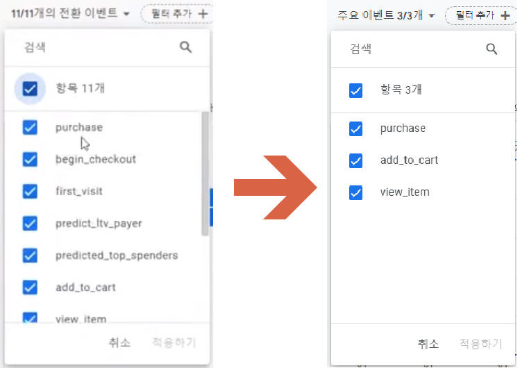 - 수집된 이벤트 항목 중 전환으로 추가하고 싶은 이벤트는 어떻게 설정할 수 있을까?