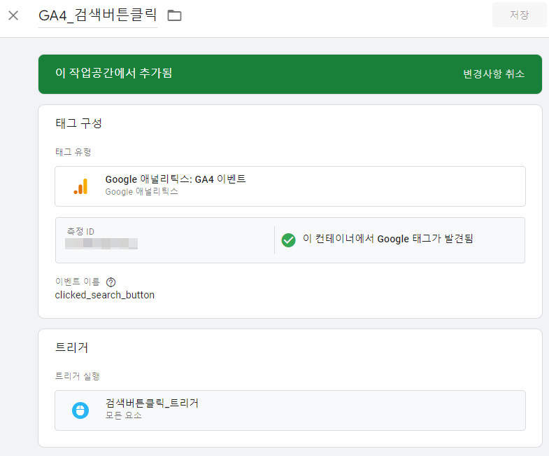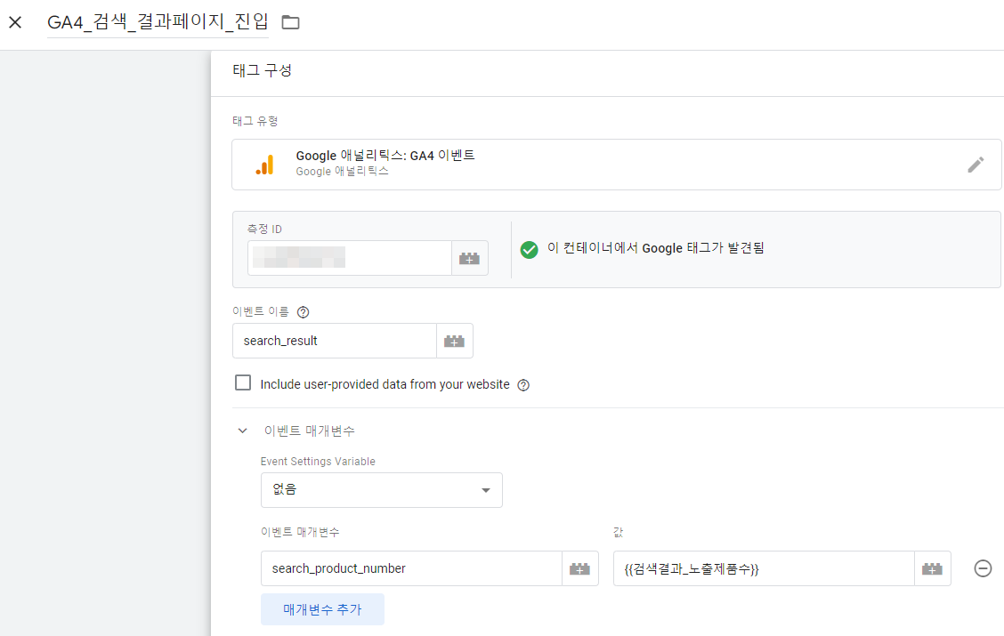 - 태그에 만든 이벤트를 업데이트 한다. 매개변수 추가를 누르고 엑셀 문서에 정의한 "search_product_number" 이름을 정의하고 값으로 이전에 만든 매개변수를 정의한다.