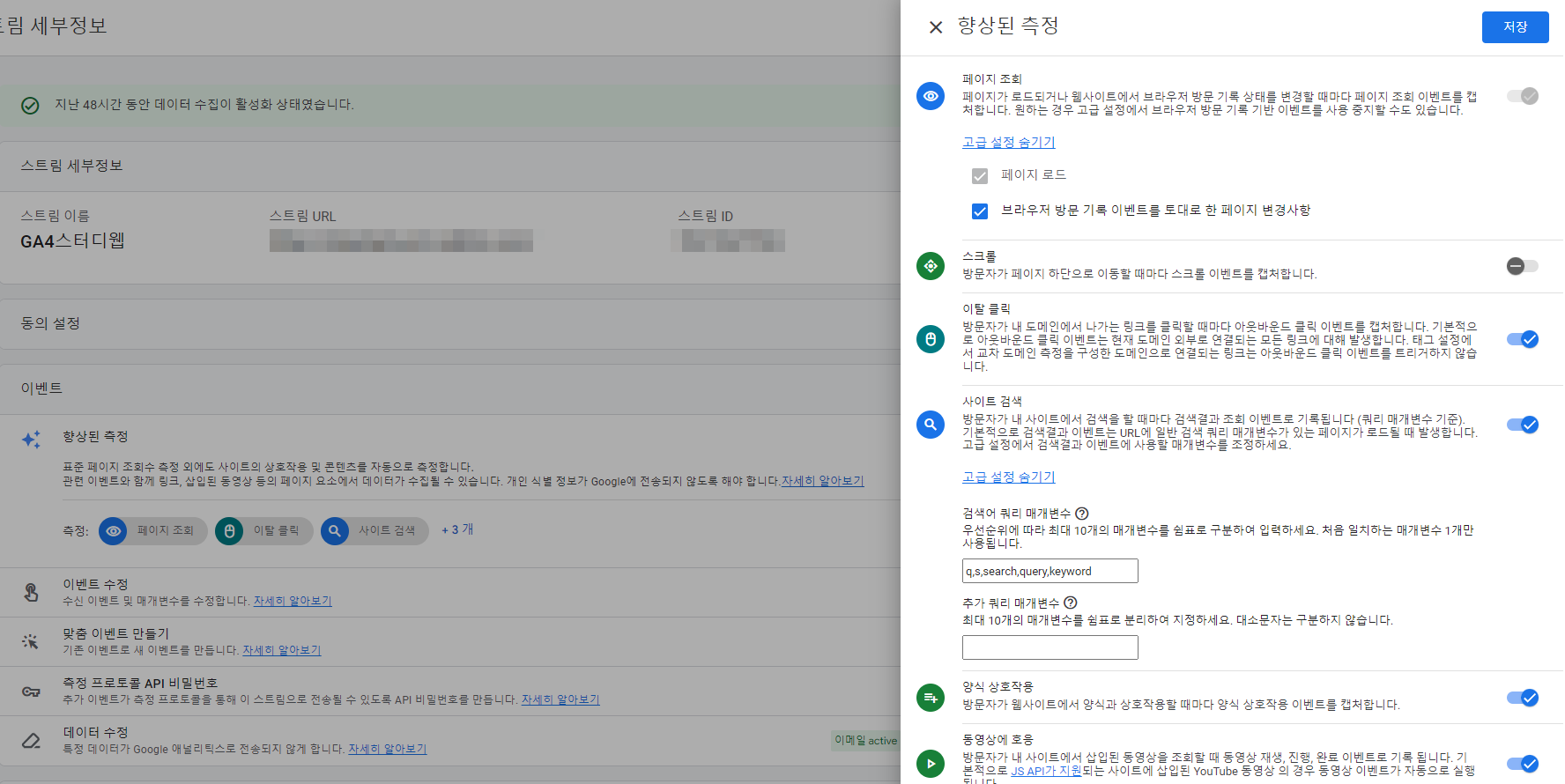 - 만약 제공해주는 데이터보다 더 디테일한 데이터 수집을 위해 직접 커스텀하고자 한다면, 향상된 측정에서 해당 데이터 수집 설정을 해제하는 것이 좋다.