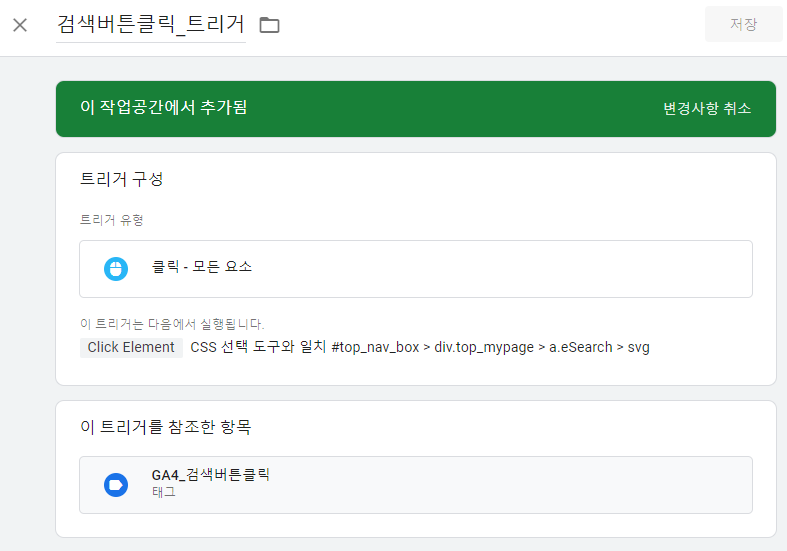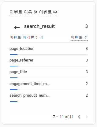 - 시나리오 : 검색 아이콘을 눌렀을 때 나오는 상단 레이드창을 이벤트로 잡아 검색을 하는 경우와 검색 창을 닫아 포기를 하는 경우를 잡아보고, 검색 결과 페이지 로드가 완료 되었을 때의 결과 개수를 이벤트 매개변수로 가져와 이 수에 따른 결과 페이지에서의 사용자 클릭 빈도를 추적해보고자 한다.