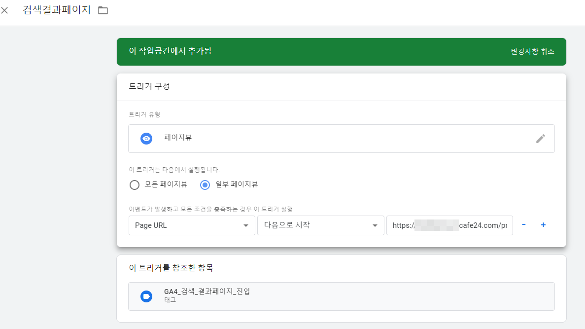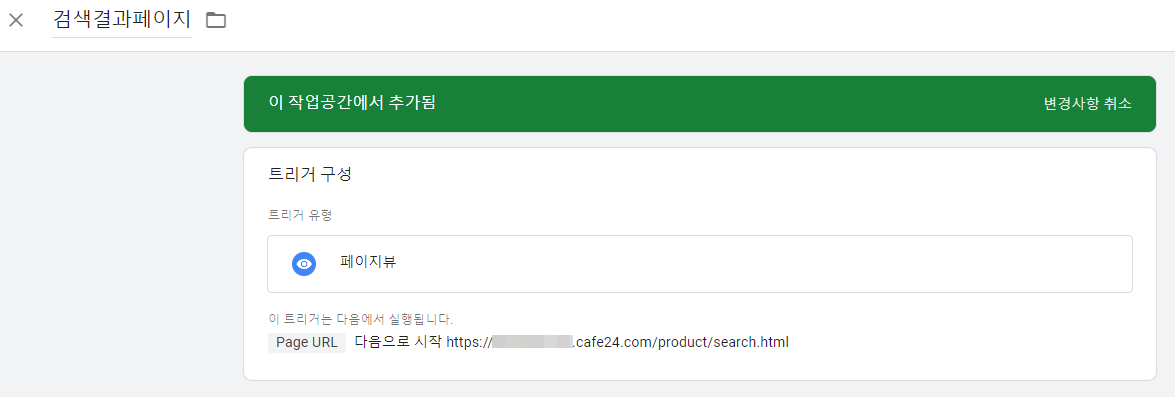 - 페이지뷰 트리거 유형을 선택하고 page URL, 다음으로 시작, 검색 결과에 동일하게 사용되는 url을 넣고 변경이 되는 query는 삭제한다.
