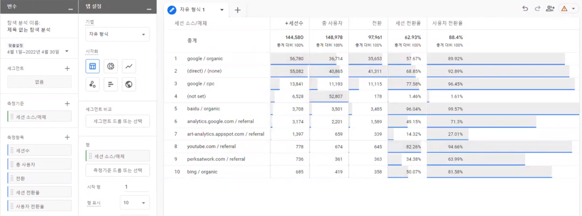 - 하나의 사용자가 여러개의 세션을 만들 수 있다. 때문에 세션 전환율이 사용자 전환율보다 낮게 나오는게 일반적이다