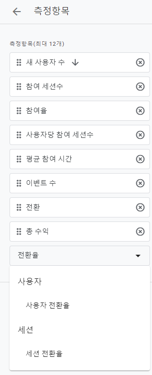 - 측정항목을 클릭하고 하단의 측정항목 추가를 눌러 전환율을 입력하면 사용자 전환율과 세션 전환율을 확인할 수 있다. 여기에서 세션 전환율을 선택한다.