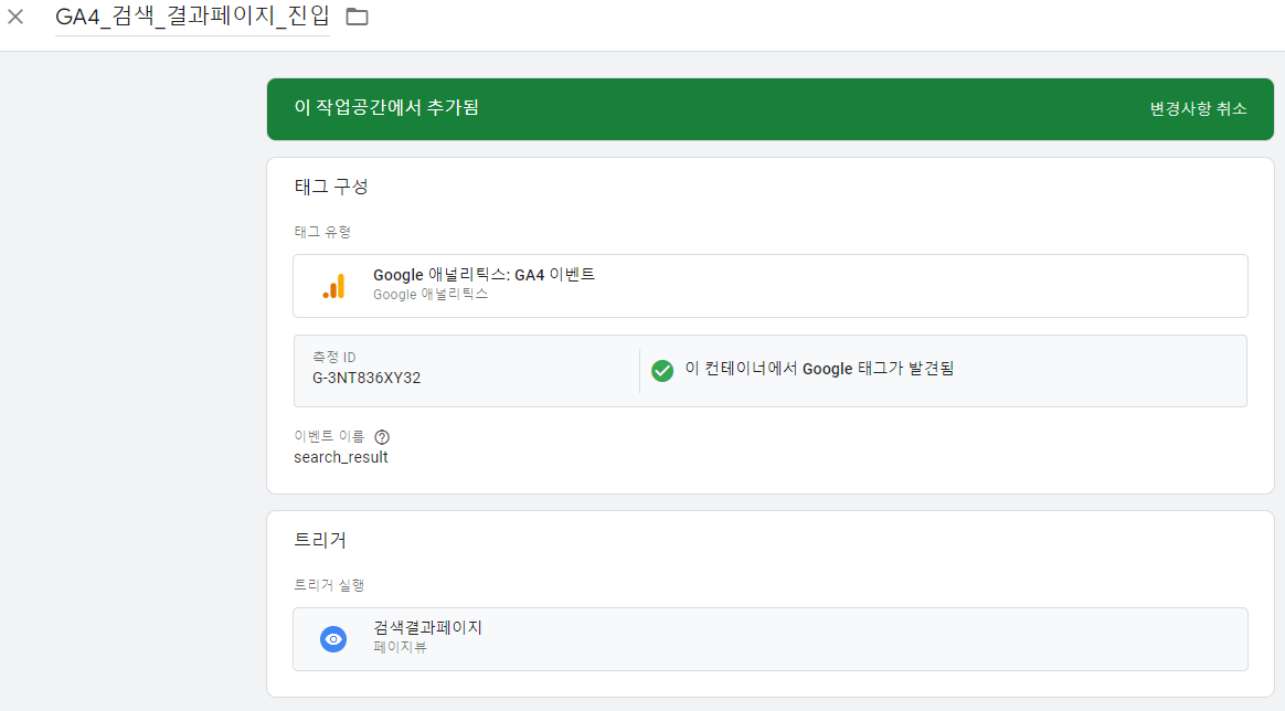 - 태그 매니저에서 만든 검색결과페이지 태그를 그대로 GA4에서 만들 수 있다.