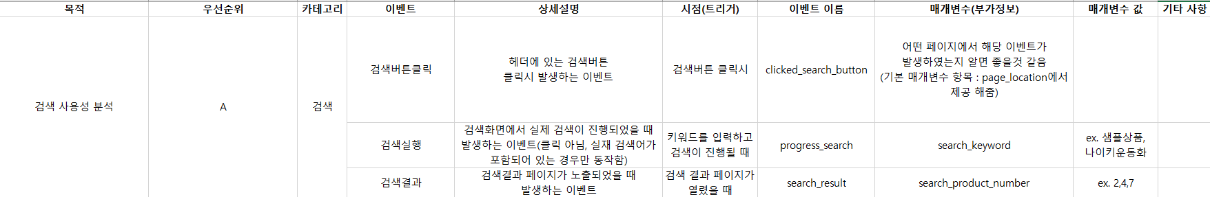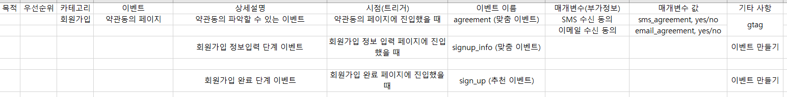 - 예시로 아래와 같은 이벤트 설계 문서(정의서)를 엑셀 등으로 작성해 관리할 수 있다.