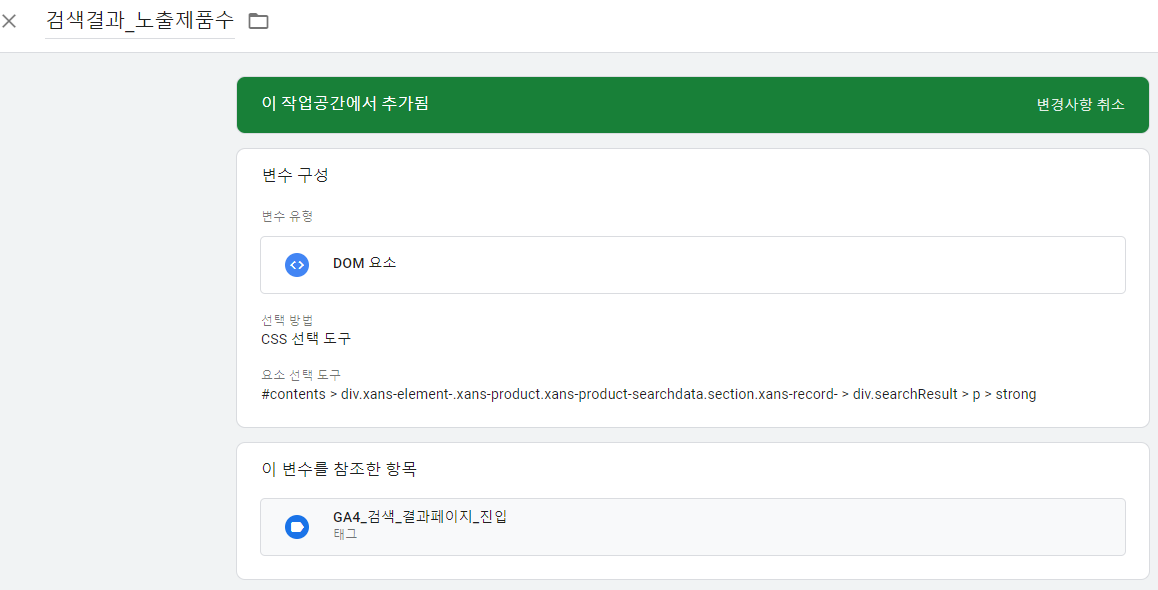 - 변수 > 사용자 정의변수 > 새로 만들기 > 변수 유형 : DOM 요소 > 선택 방법 : css 선택 도구 > 요소 선택 도구 : 복사한 selctor 결과 붙여넣기