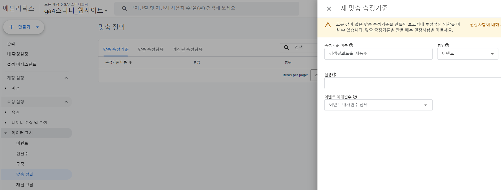 - 관리 > 맞춤정의 > 맞춤 측정기준 만들기 > 이벤트 매개변수에서 search_product_number를 정의한다.