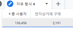 - 전자상거래 구매를 측정항목으로 가져와 총 사용자와 비교해 본다.