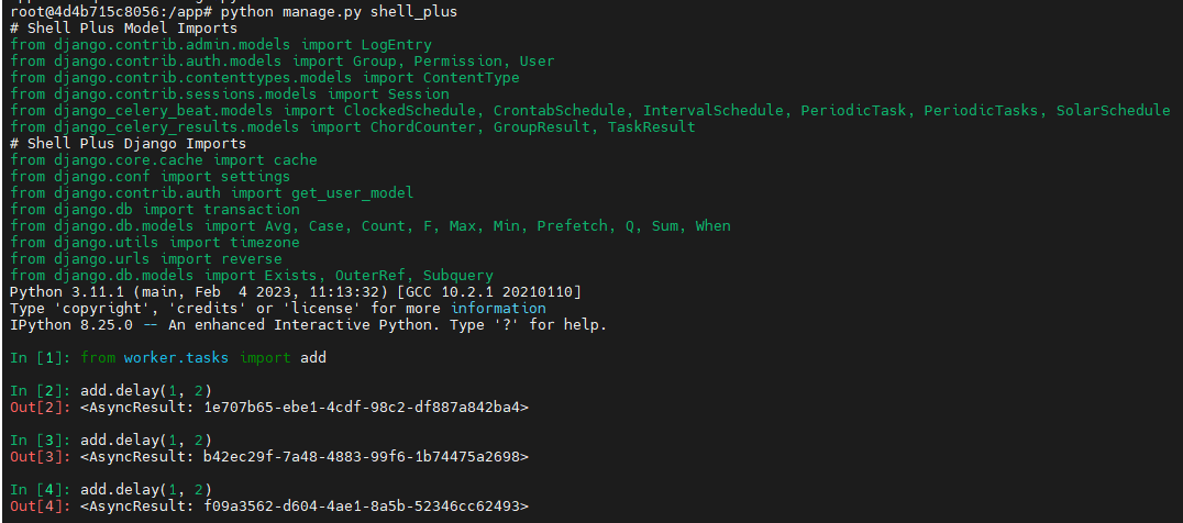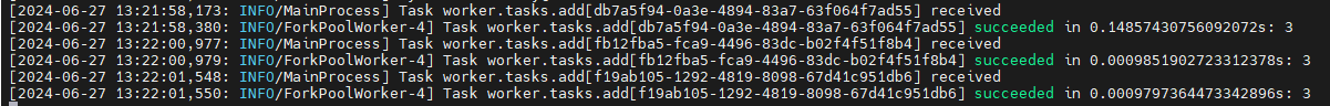 - 이 예시에서는 add 함수를 apply_async() 메서드를 사용하여 비동기적으로 실행한다. 작업이 큐에 넣어지고 즉시 AsyncResult 객체가 반환된다. 이후 get() 메서드를 호출하여 작업 결과를 확인할 수 있다.