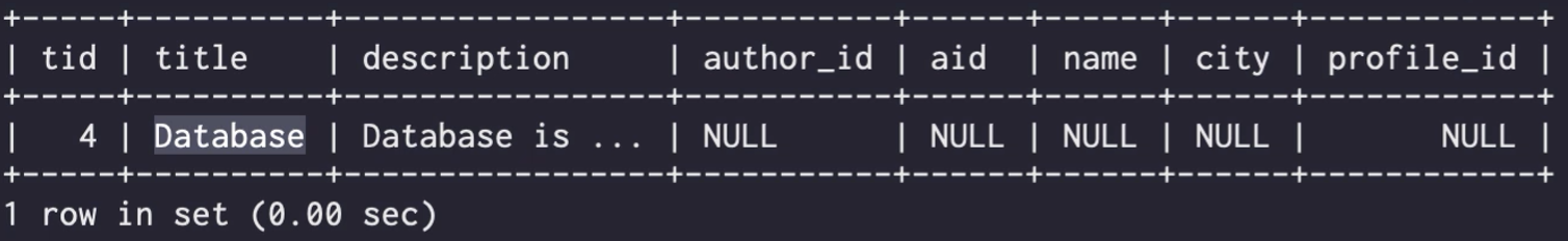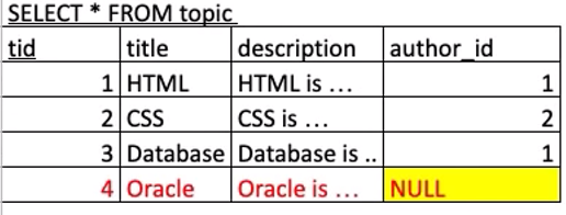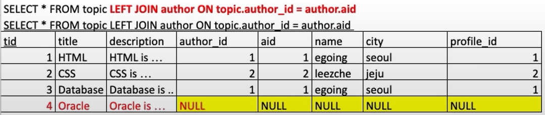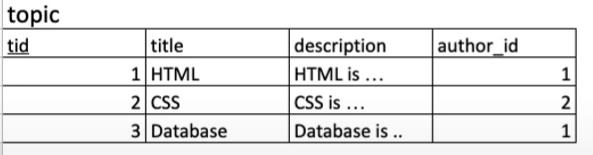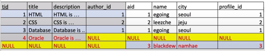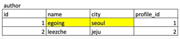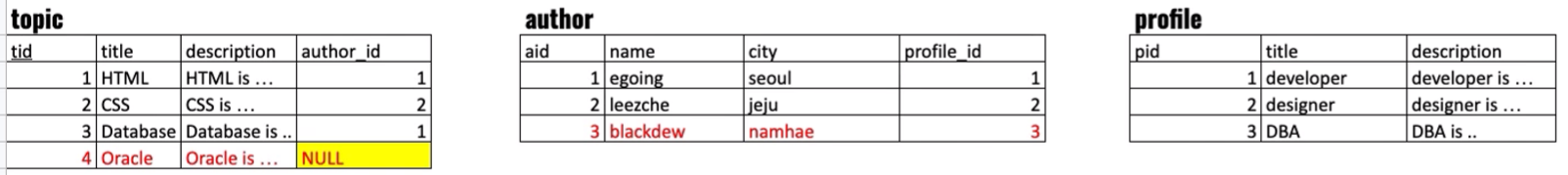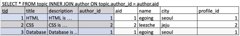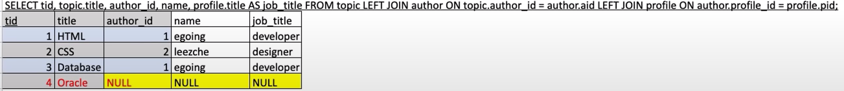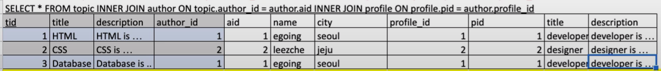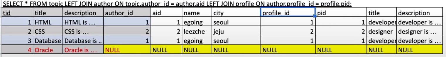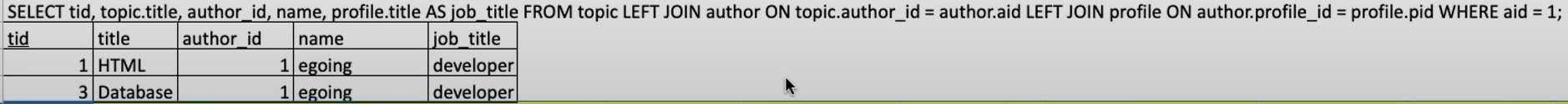 - 목표 : 분리된 3개의 테이블 topic, author, profile을 하나의 테이블로 join을 함