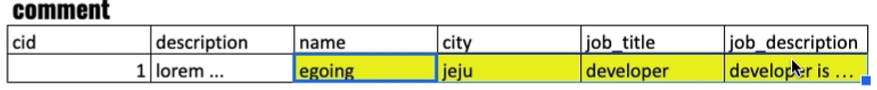 1-2) 문제점 : comment 테이블에서 topic과 동일한 name, city, job_title, job_description을 저징하는 경우,