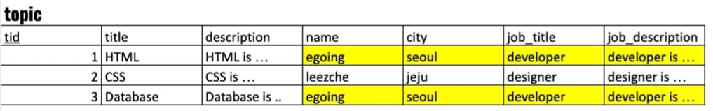 1-1) 문제점 : name의 egoing이라는 사람의 이름을 변경할 경우, 1000만건의 데이터가 있다면 모든 테이블을