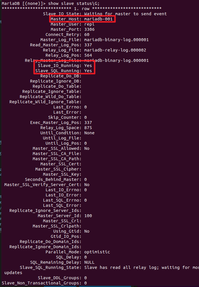 CHANGE MASTER TO MASTER_HOST='mariadb-001',MASTER_USER='repl',MASTER_PASSWORD='repl',MASTER_LOG_FILE='mariadb-binary-log.000001',MASTER_LOG_POS=337;