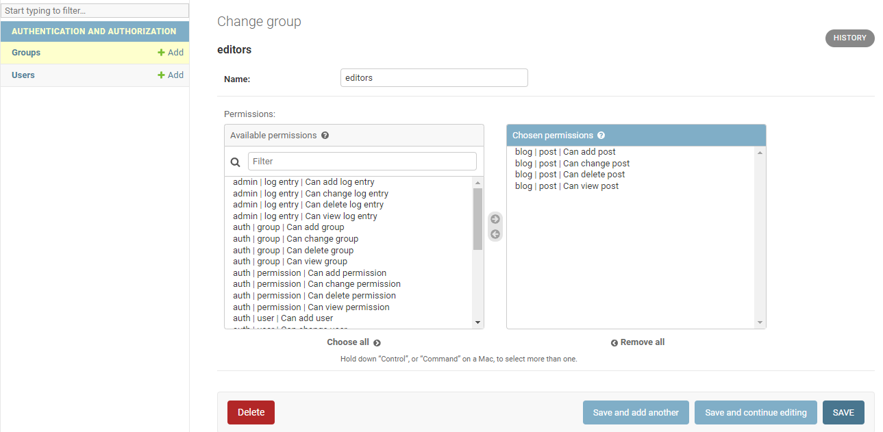 - admin 페이지에서 'editors' 라는 그룹을 생선한 후, 해당 그룹에 사용자가 포함되는 경우