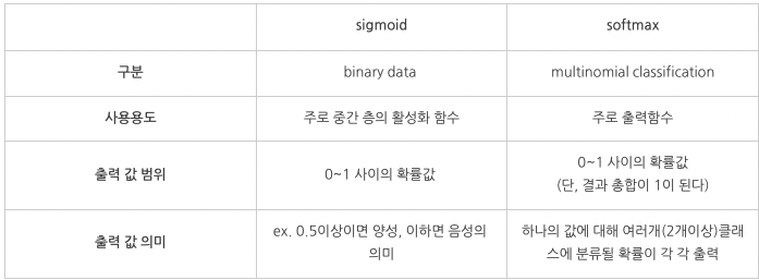 - 이진 분류의 경우 시그모이드 함수를 사용하여 0~1 사이의 값으로 변환을 시키는데 다중 분류의 경우 소프트맥스(softmax) 함수를 이용해 7개의 타겟값을 확률로 변환한다.