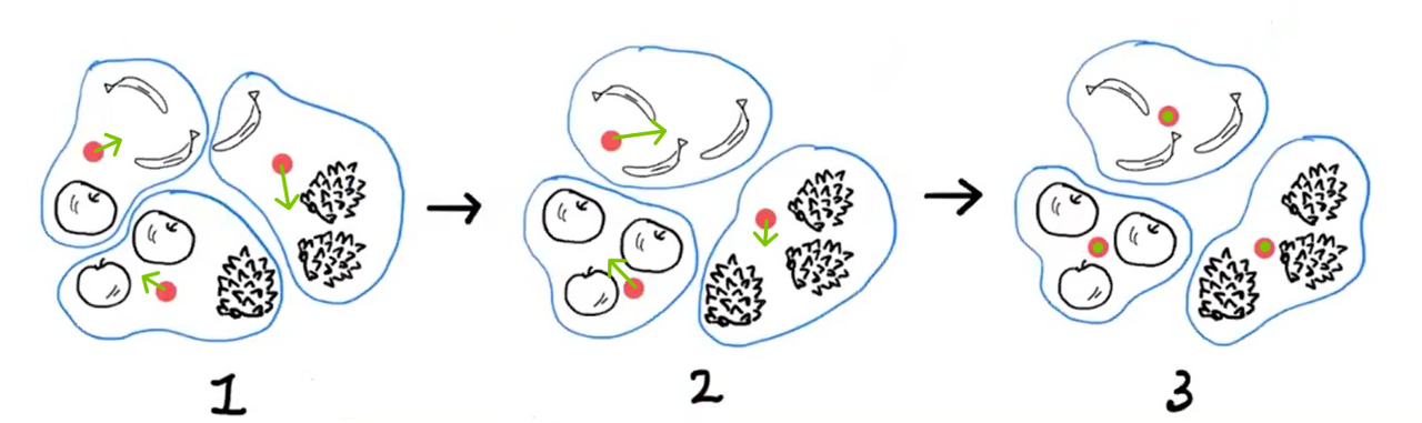 3. 각각 묶여있는 클러스터 내 샘플들로 다시 클러스터 중심(평균값)을 계산한다.