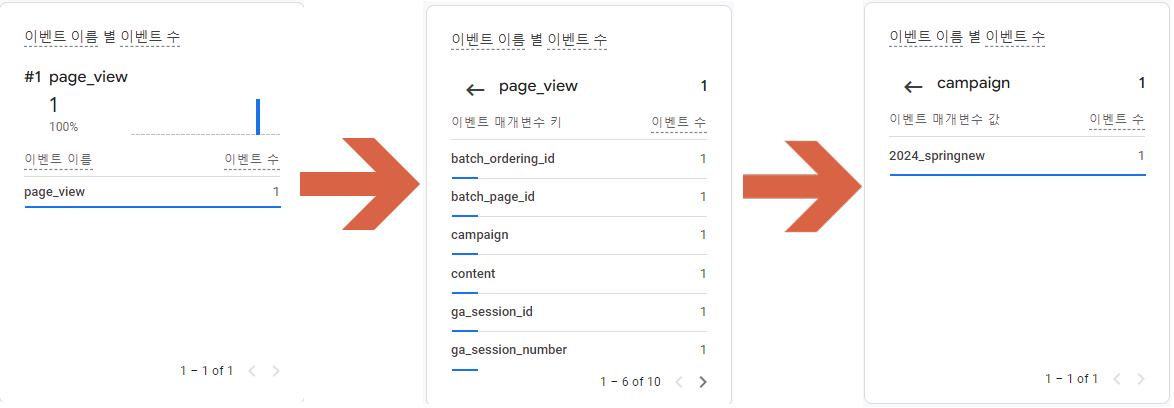 - GA4 실시간 -> 이벤트 이름 별 이벤트 수 -> page_view -> campaign -> 2024_springnew