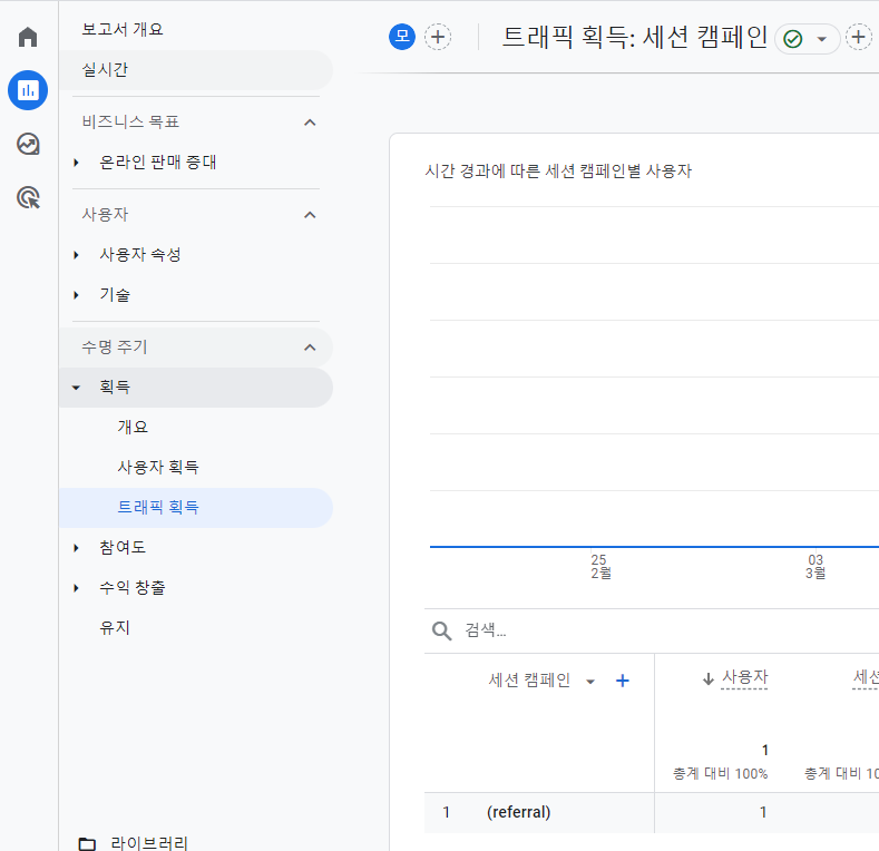 - 획득 -> 트래픽 획득 -> 세션 기본 채널 그룹을 눌러 세션 캠페인으로 변경