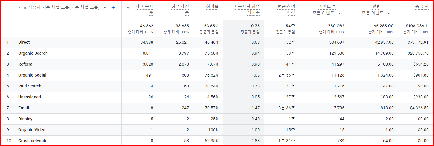 - Direct, Organic Search, Referral은 자발적으로 사용자들이 방문한 채널이다.