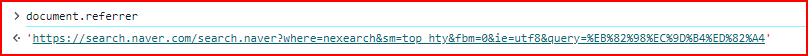 - 개발자 도구의 console에서 document.referrer을 출력하면 이전 출발지에 대한 사이트 정보가 담겨져 있다.