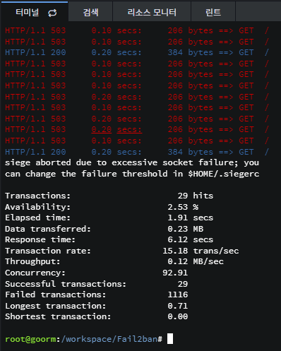 4) 스트레스 테스트 siege로 DDoS 설정 테스트하기