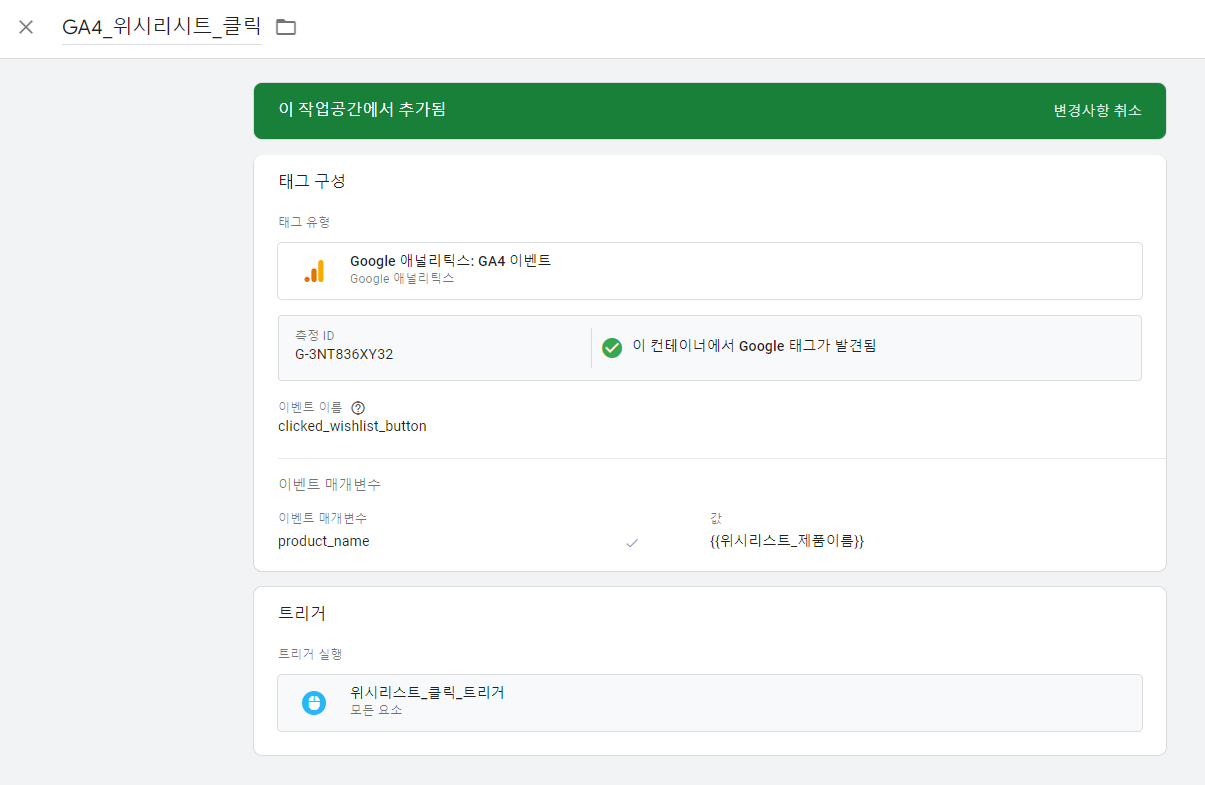 - 트리거 만들기 : Click Element > css 선택 도구와 일치 > 크롬 개발자 도구에서 위시리스트 버튼에 해당하는 select를 복사하여 붙여 넣는다.