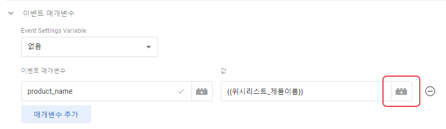 - 태그 만들기 : 태그를 새로 만드는데 이번에는 이벤트 매개 변수를 추가한다. 매개변수의 이름은 직접 정의하고, 값은 오른쪽에 있는 레고 모양의 아이콘을 클릭해 이전에 생성한 변수를 선택하면 된다.