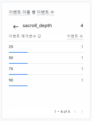 - GA4의 실시간 > 이벤트 항목 > scroll > scroll_depth 를 보면 4개 항목이 각각 들어와 있는 것을 확인할 수 있다.