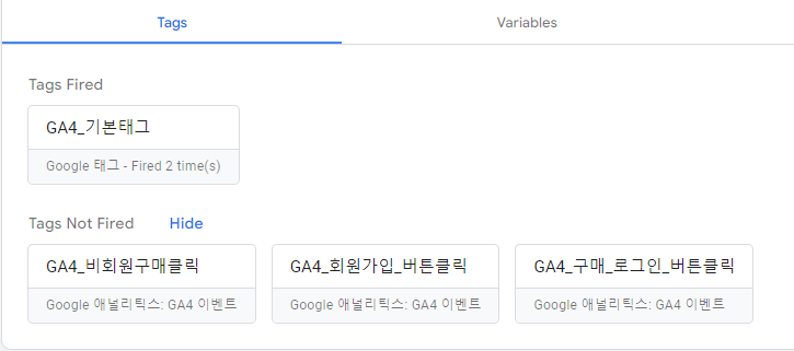 - 오른쪽 상단 미리보기를 누르고 연결된 화면에서 테스트를 수행할 경우 debug 화면에서 초기에 tags not fired 항목에 있던 GA4_비회원구매클릭 박스가 tags fired로 이동되는 결과를 확인할 수 있다.