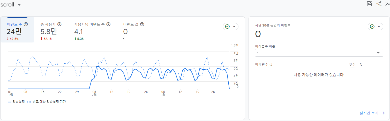- 보고서 > 참여도 > 이벤트 > 화면의 결과에서 scroll 선택 > 비교 결과를 원한다면 기간 설정