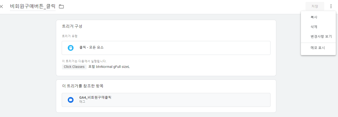 - 트리거에서 복사한 방법과 마찬가지로 원하는 태그를 누르고 오른쪽 상단 점 세개로 되어 있는 버튼을 눌러 복사 메뉴를 누른다.