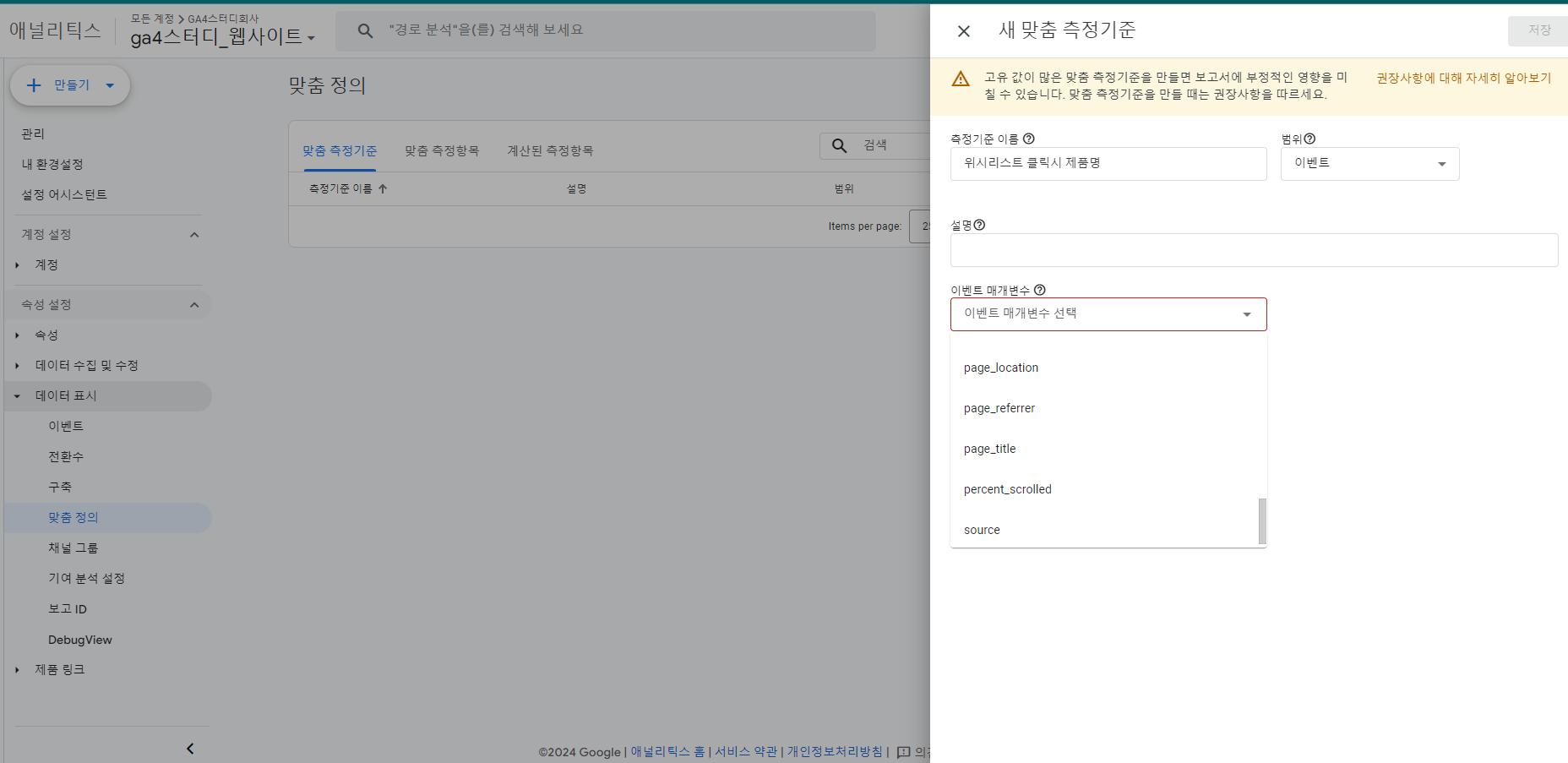 - 관리 > 맞춤정의 > 맞춤 측정기준 만들기