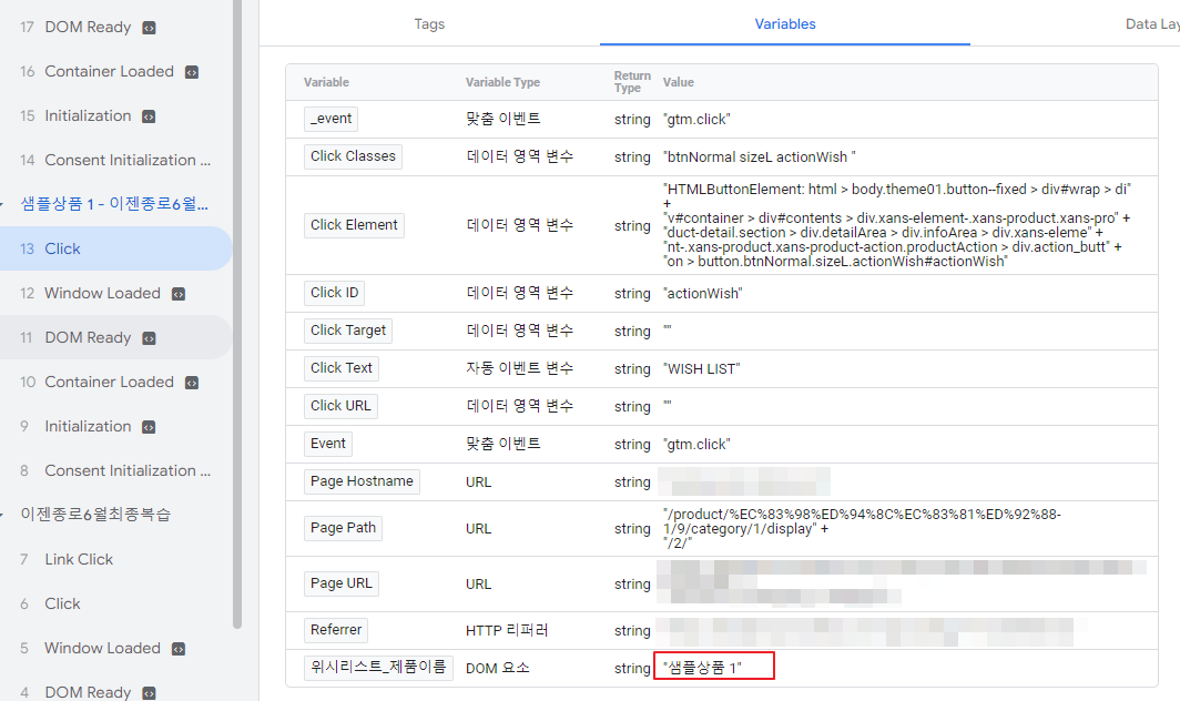 - 히스토리 항목들 중 Click 을 찾아 오른쪽 화면에 있는 Variables 탭을 누르면 관련한 변수 정보들을 확인할 수 있는데 이 곳의 click Text가 "회원가입"인 Click을 찾으면 된다.