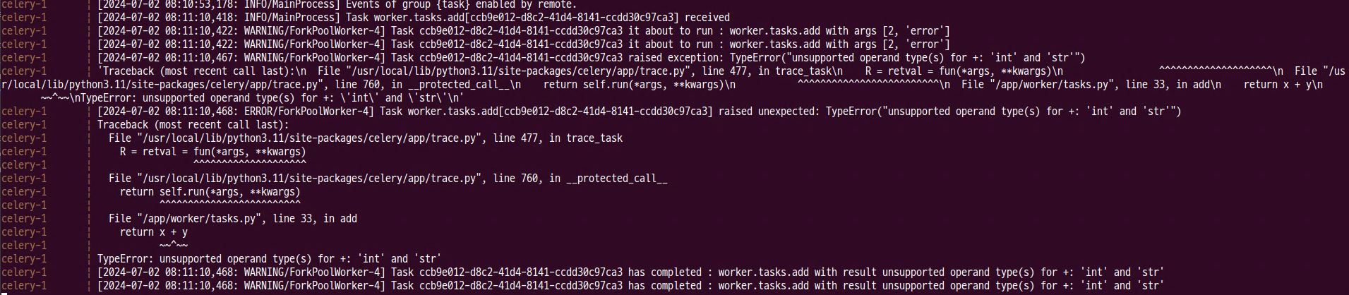 celery-1 | [2024-07-02 08:11:10,468: ERROR/ForkPoolWorker-4] Task worker.tasks.add[ccb9e012-d8c2-41d4-8141-ccdd30c97ca3] raised unexpected: TypeError("unsupported operand type(s) for +: 'int' and 'str'")